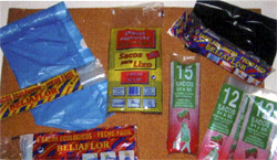 | Sacos de plástico lisos e impressos para resíduos. Embalados em rolos, existe em azul perfumado, preto e branco. |
